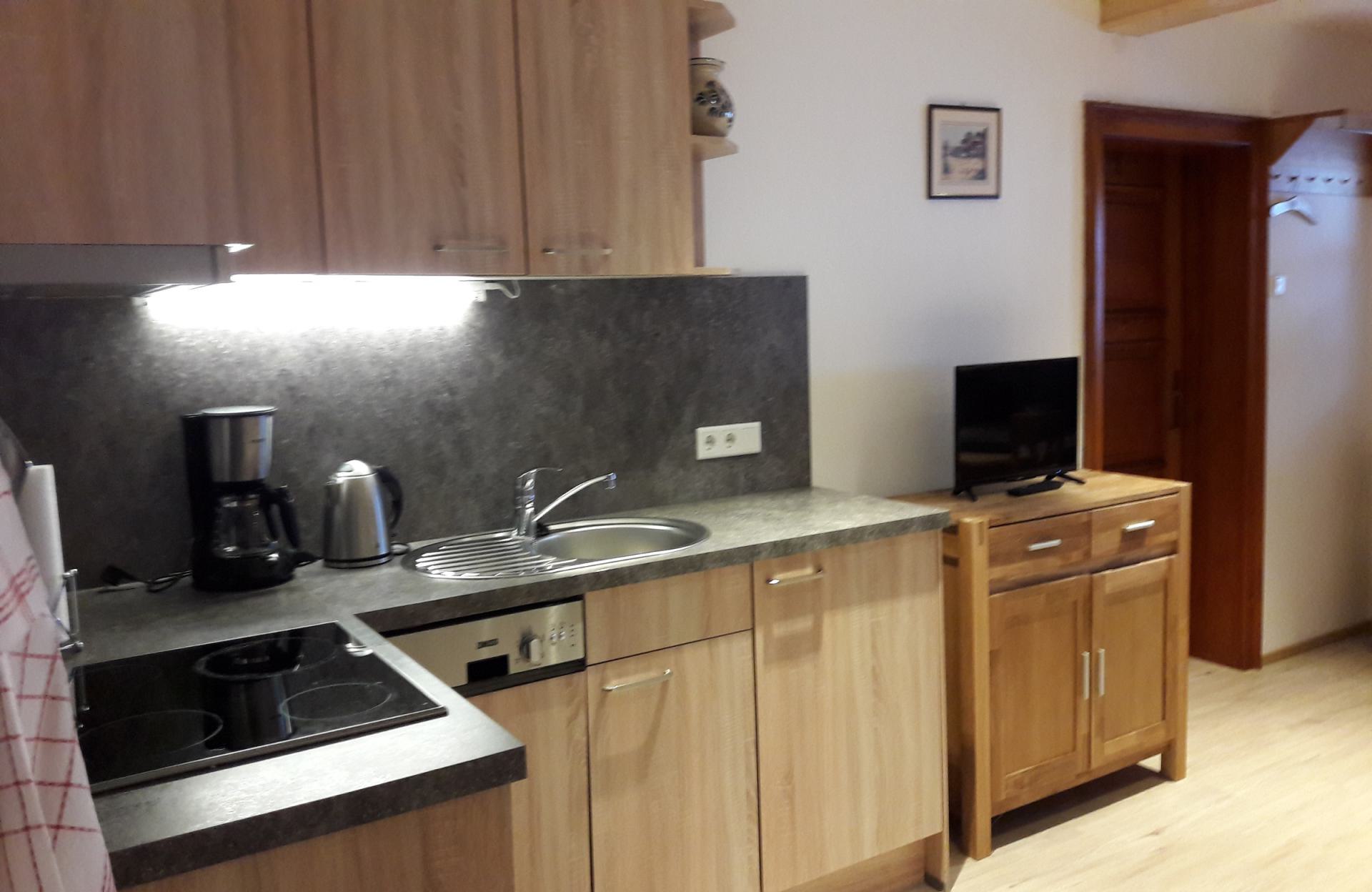 Die Küchenzeile ist ausgestattet mit Kühlschrank (Gefrierfach), Backofen, Spülmaschine, Kaffeemaschine, Wasserkocher, Eierkocher, Toaster, div. Küchenutensilien, Geschirrtücher etc.