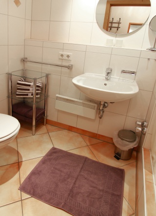 Bad ausgestattet mit Handtüchern, Fön, Kosmetikspiegel, Toilettenpapier